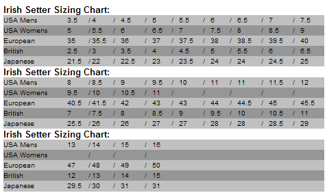 Irish Setter Boot Size Chart | My XXX Hot Girl